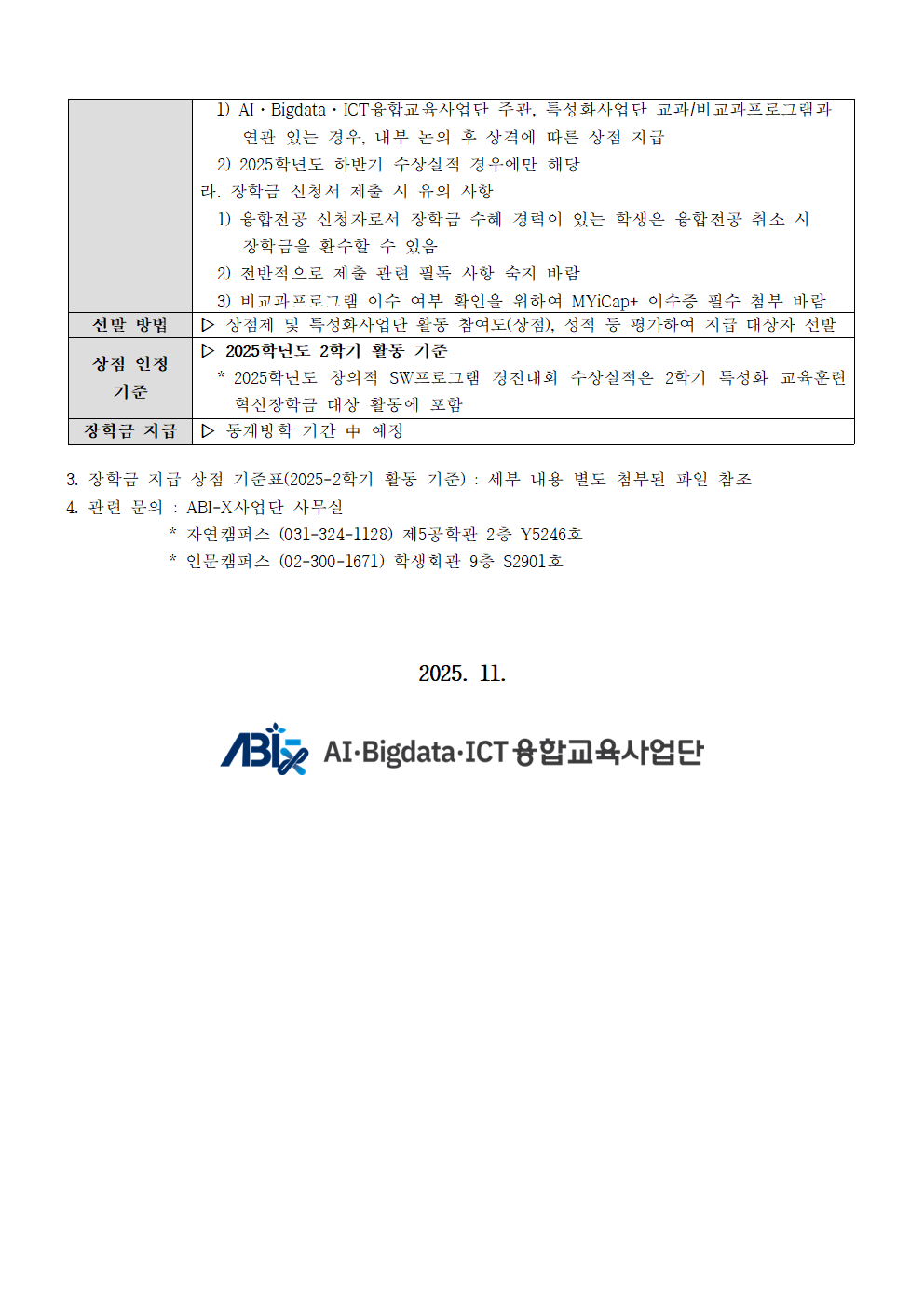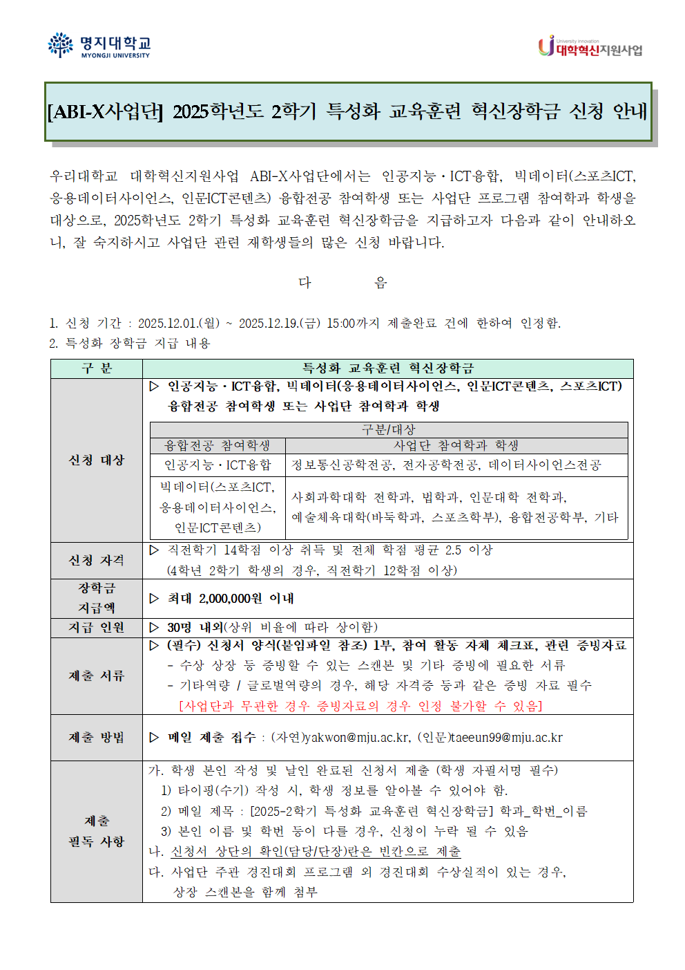 fnctId=bbs,fnctNo=1394 2025학년도 2학기 특성화 교육훈련 혁신장학금 신청 안내 작성일2025.11.21 수정일2025.11.21 작성자 권*아 조회수416 첨부파일 [ABI-X사업단] 2025-2학기 특성화 교육훈련 혁신장학금 신청서 양식.hwp