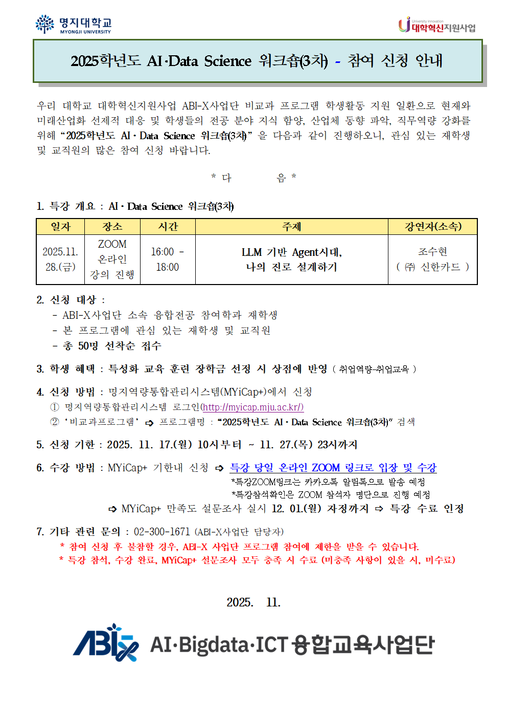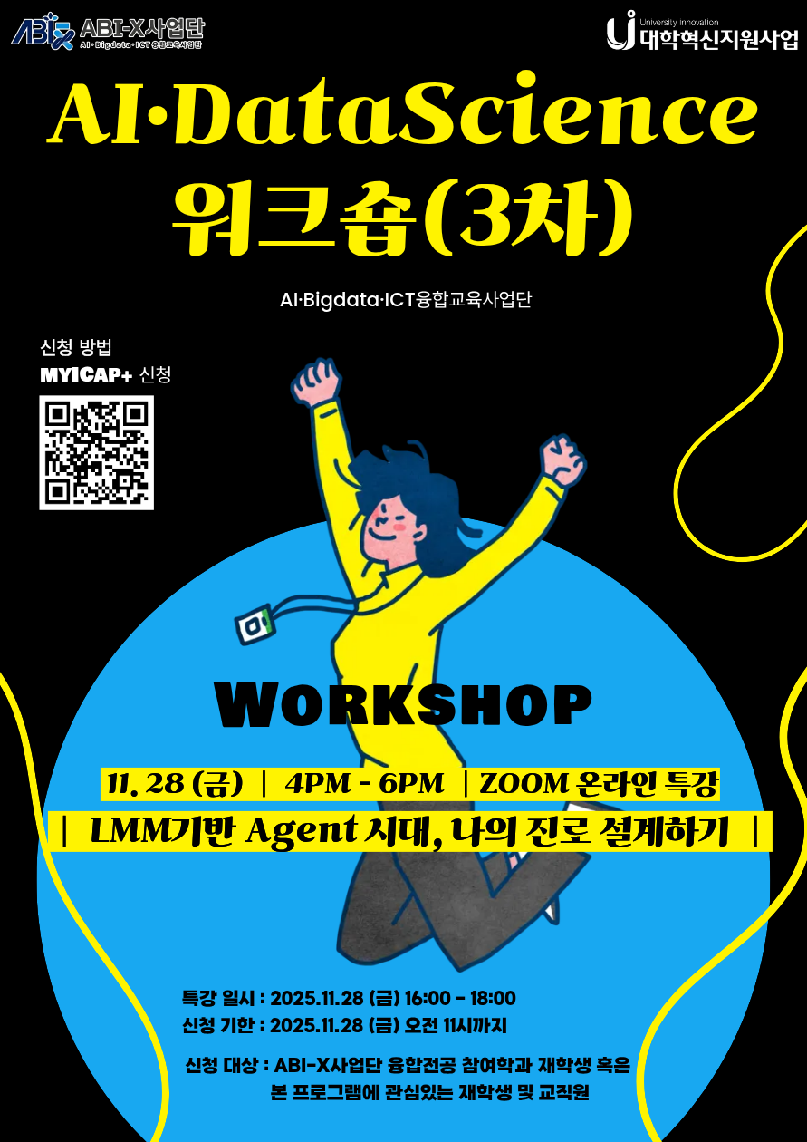 fnctId=bbs,fnctNo=1394 [ABI-X사업단]2025학년도 AI·Data Science 워크숍 (3차) 신청 안내 작성일2025.11.14 수정일2025.11.17 작성자 김*은 조회수128 첨부파일 첨부파일이(가) 없습니다.